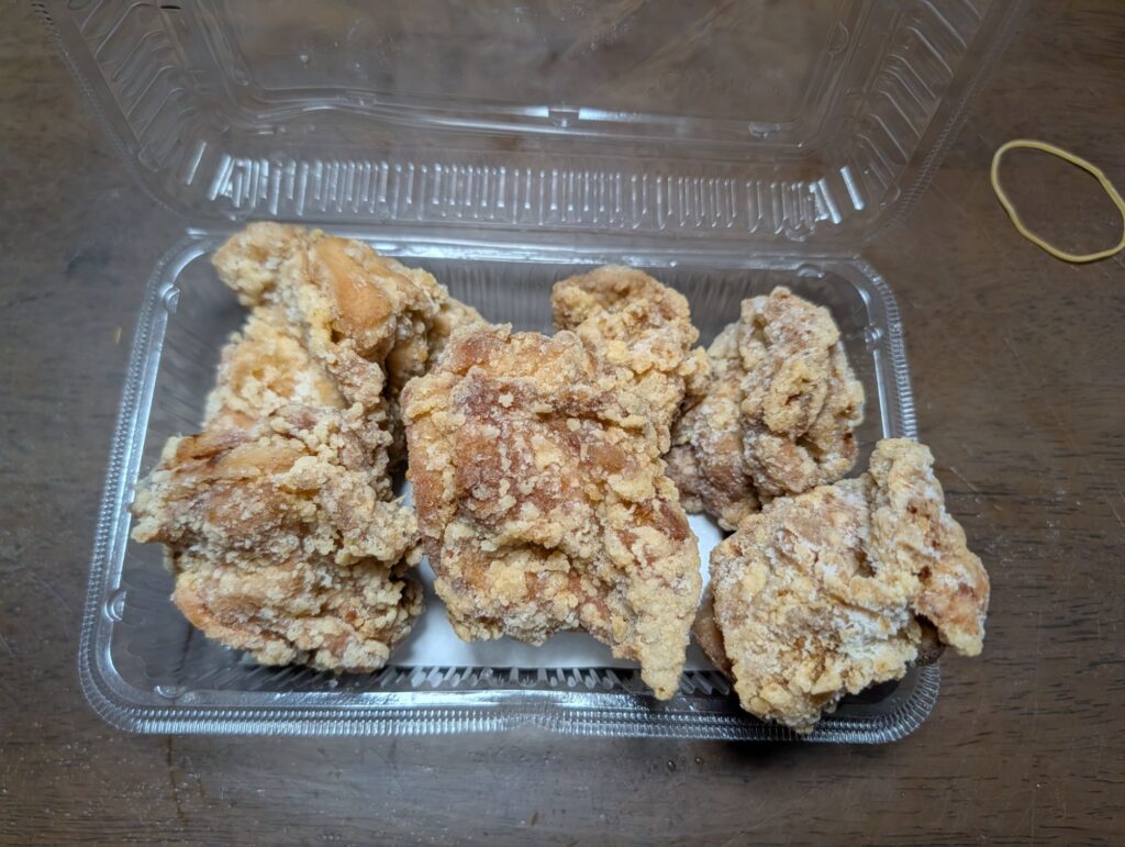 私が買った唐揚げは大きめサイズ6個で463円でカリカリ薄味で食べやすく美味かったです
