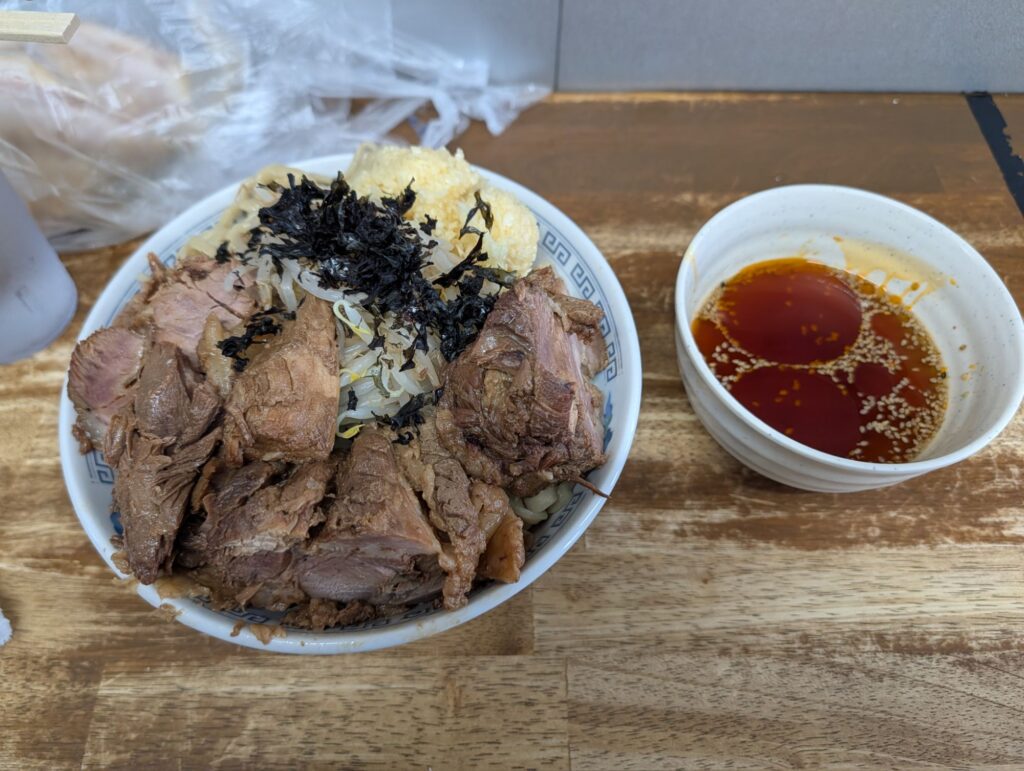 つけ汁にニンニクをドッパリ入れて、ラー油とニンニクのダブルピリピリで箸が止まらん豚もコレでもかと言うほど乗っけてくれてるありがとう(*^^*)