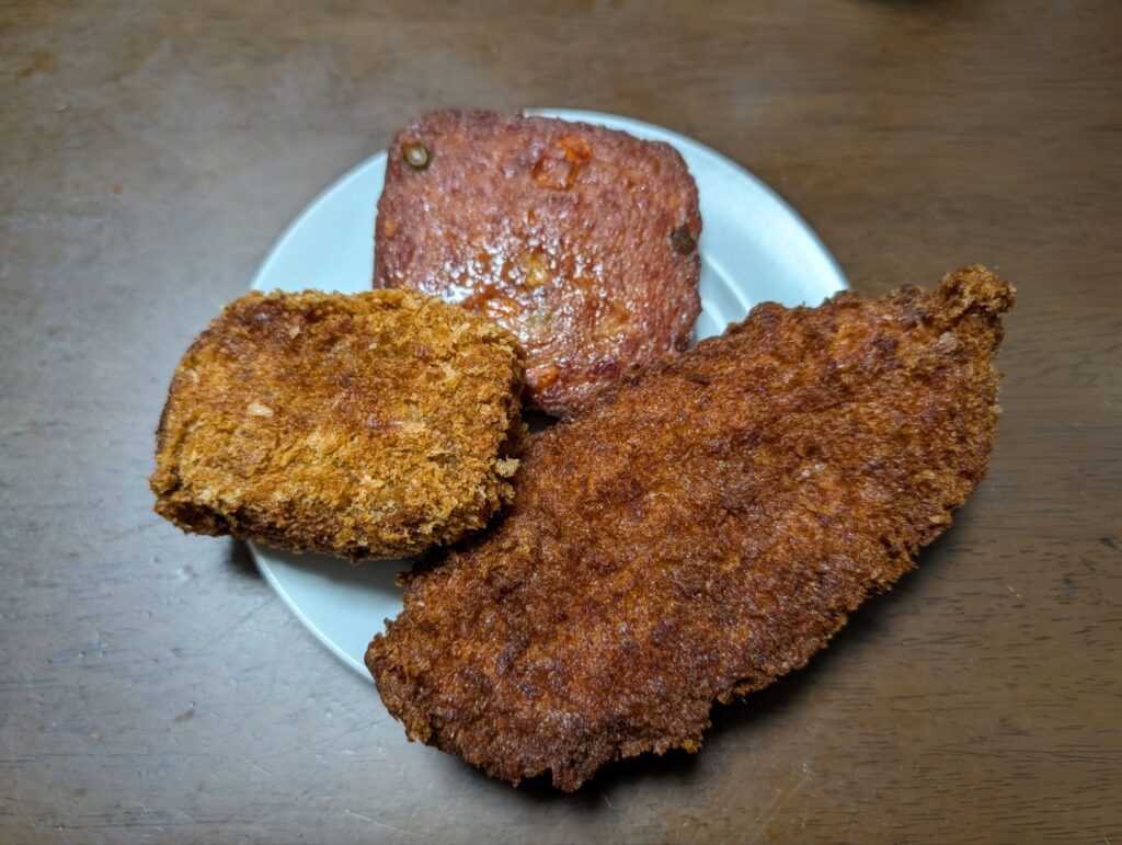 左からコロッケ、厚切りニンニクハム、チキンカツ