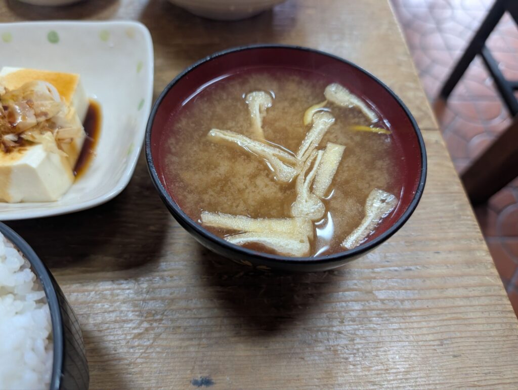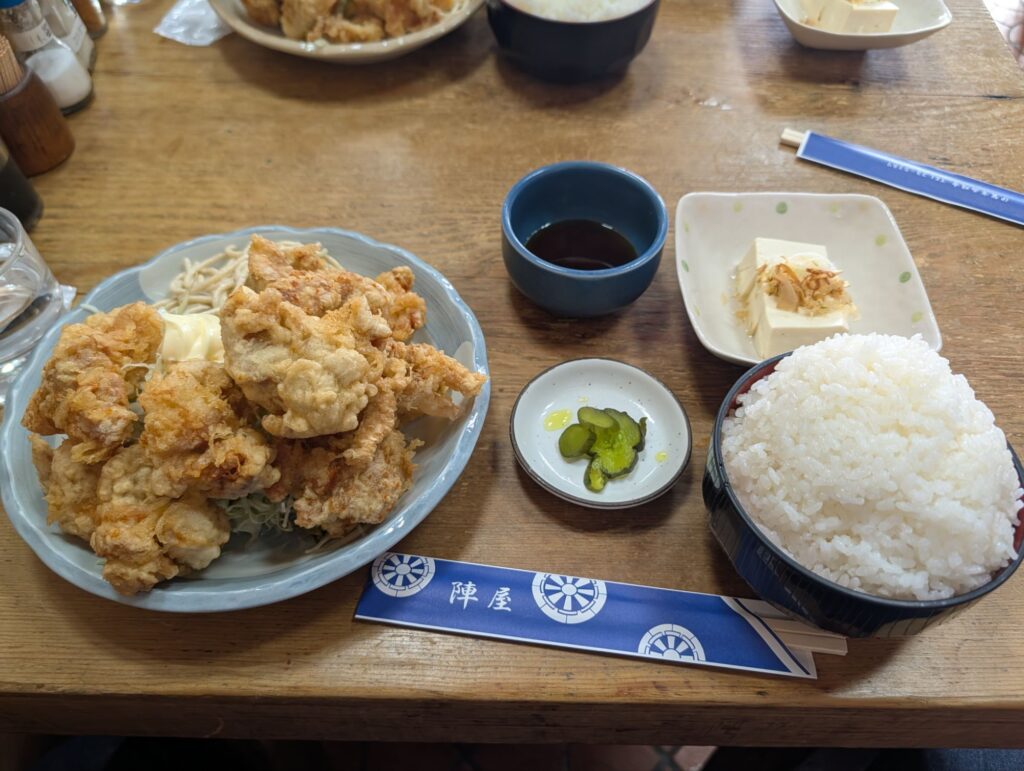 メイン皿のトリカラ、小鉢(冷奴)、味噌汁、ご飯、漬物、ポン酢とゴージャス